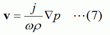 ヘルムホルツ方程式(6)を解くことで求められた音圧pを下記の関係式(7)に代入することで、粒子速度vを求めます。
