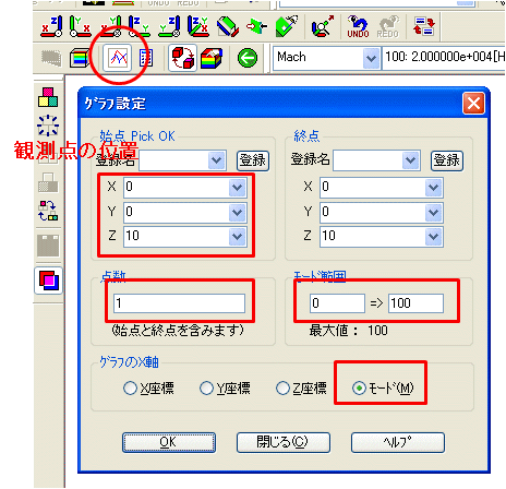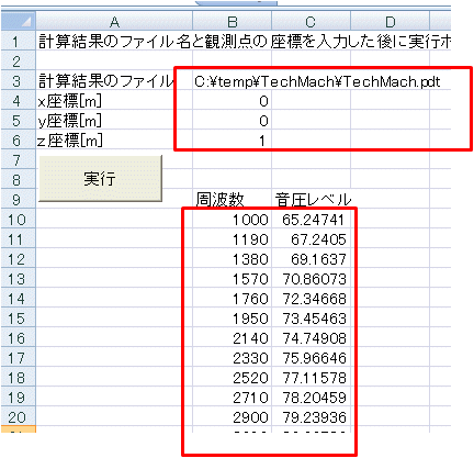 次に「解析領域外の音圧.xls」を開き、保存したメッシュ/計算結果のファイル名、観測点の位置[m]を入力し、