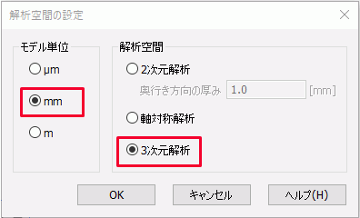 解析空間を設定します。 以下のようになっているか確認し、をクリックします。 モデル単位:mm 解析空間:3次元解析