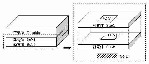 このチュートリアルでは、2層になった誘電体の表面の一部にそれぞれ異なる電極(+1[V]、+2[V])を与えた場合の静電界の様子を解析します。