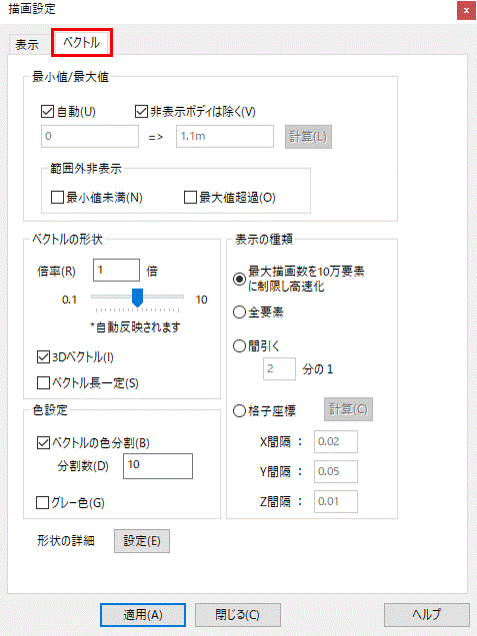 現在設定されているフィールドタイプのコンターおよびベクトルの値が、出力ウィンドウに表示されます。 |