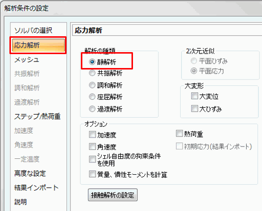 [応力解析]タブをクリックします。 [解析の種類]が[静解析 時間的に変化のない解析。たとえば一定の力を加えた時の応力解析や直流電流による磁界解析など。]になっていることを確認し、をクリックします。