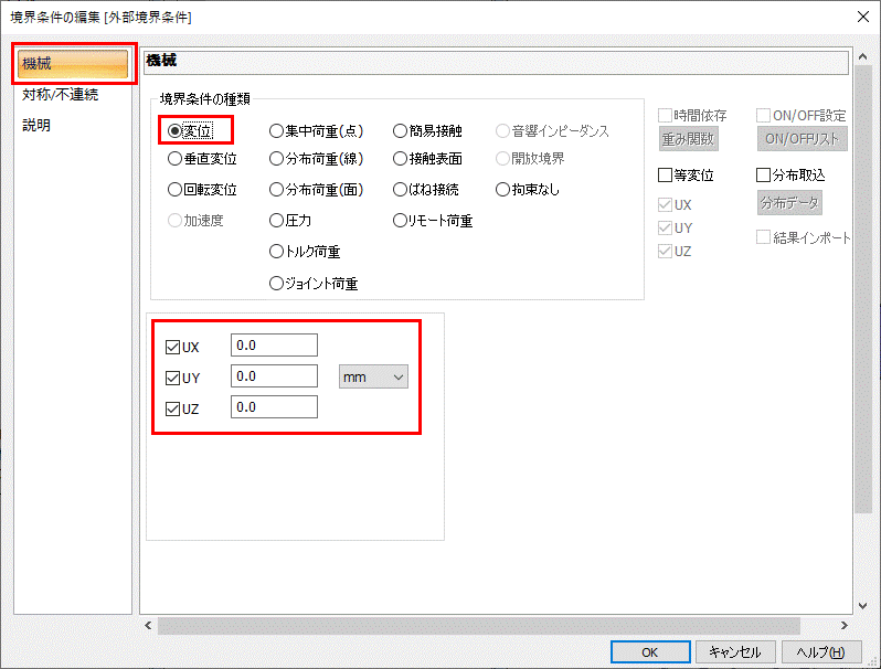 変位を拘束するには、境界条件の種類:変位に設定後、