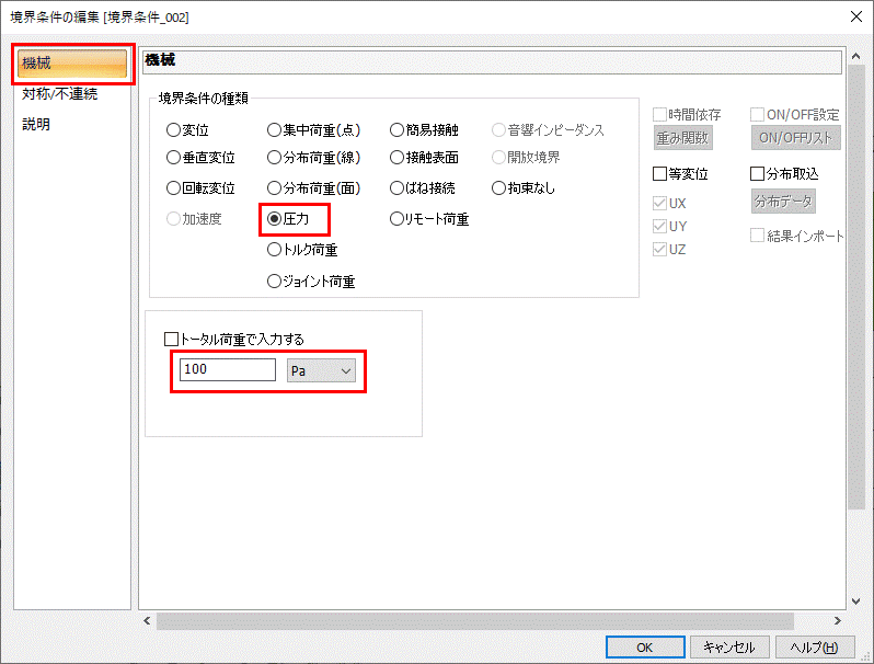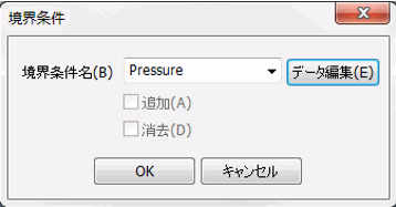 境界条件の編集ダイアログにおいて、上面の内側に圧力をかけるという条件を設定します。