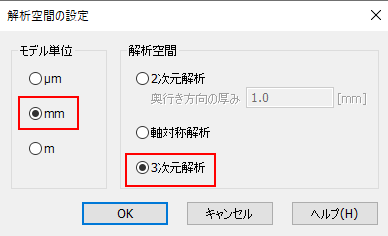 解析空間を設定します。 以下のようになっているか確認し、をクリックします。 モデル単位:mm 解析空間:3次元解析