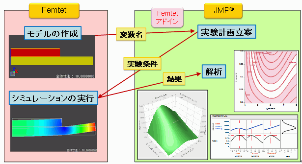 Femtetで作成したモデルをJMP®で計画した実験計画に基づいて実行し、結果を解析します。