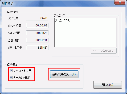 解析が終了すると、[解析終了]ダイアログが表示されます。