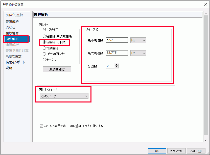 [解析の種類]が[調和解析]になっていることを確認します。