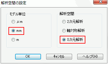 解析空間を設定します。 以下のようになっているか確認し、をクリックします。 モデル単位:mm 解析空間:3次元解析