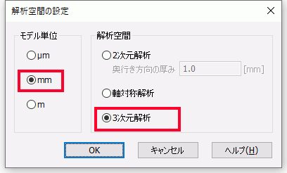 解析空間を設定します。 以下のようになっているか確認し、をクリックします。 モデル単位:mm 解析空間:3次元解析