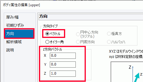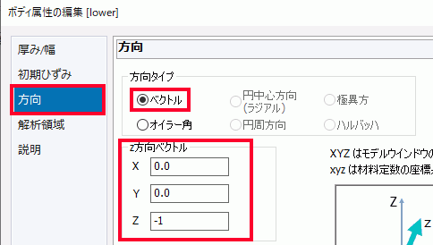 ボディ属性とは、ボディ毎に設定する属性で、2次元解析のときの厚み、線要素を使用するときの線要素の幅、異方性材料を使用するときの座標系などを設定します。