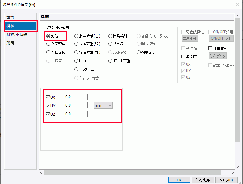 変位を拘束するには、境界条件の種類:変位に設定後、
