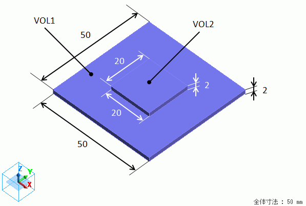 基板(VOL1)と発熱体(VOL2)それぞれを直方体のソリッドボディで定義し、発熱体にはボディ属性で発熱量を設定、