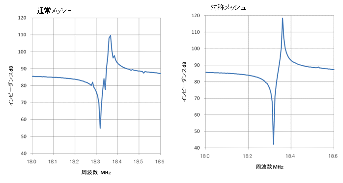 対称に近く、通常メッシュに比べて結合係数kの値は小さくなっており、対称メッシュの効果が表れて