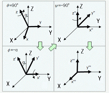 材料の座標系を解析空間の座標系に変換するためには、3回の回転操作が必要になり、