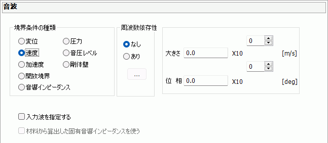 調和解析で、境界条件の種類として「速度」を選択した場合に利用できます。 速度等の駆動の境界条件は、入力波と反射波が足し合わされた状態で、指定した条件を満たす状態を求めます。 その為、これをチェックしない場合、入力パワーは、反射の影響を受けます。反射量は一般に周波数依存するので、入力パワーも周波数依存する事になります。 これをチェックすると、入力波を指定することになりますので、材料に周波数依存がなければ、入力パワーにも周波数変化がなくなります。 ただし、損失のある材料には設定できません。