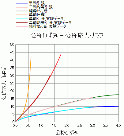 材料試験データを登録することで、材料試験データを精度良く表現できる各モデルの係数を、 単軸引張、均等二軸引張、純粋せん断、単軸圧縮の4種類の材料試験データを登録することができます。 複数のデータを登録している場合、すべての材料試験データを表現するように、係数を計算します。 登録したい試験の種類について、チェックボックスにチェックを入れ、