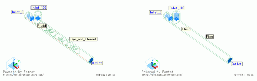 パイプ内の流路にエレメントと呼ばれる壁面が存在するモデルと存在しないモデルを使用して比較を行います。