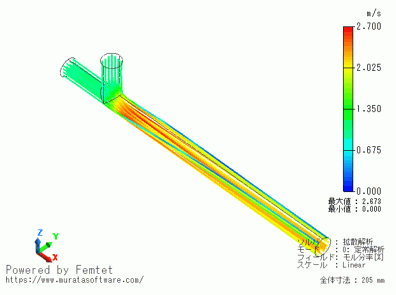 水と、拡散物質の溶け込んだ水溶液をスタティックミキサーで混合する解析です。
