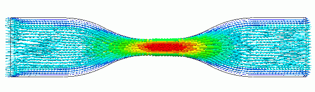 ベンチュリー管の絞り部(中心部)の入口、出口付近で流速が大きく変化していることがわかります。