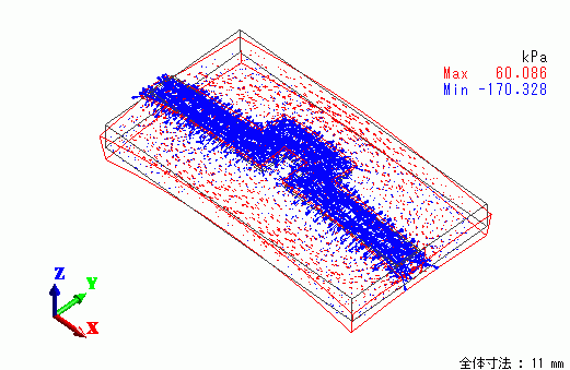 ここでは応力解析の結果として変位図を示します。ベクトル表示は応力であり単位は[Pa]です。