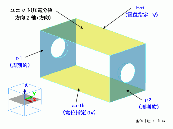 対称面で切断し、切断した面に周期的境界条件を設定します。ユニットの上面には電位1V