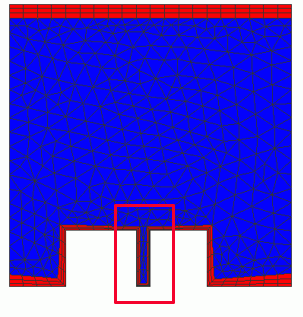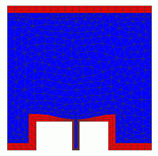 [節点毎に調節[係数自動]]を指定した場合、自動調節が必要な箇所の高さを低く設定し、そこから離れるにつれて少しずつ高さを高くしていきます。 以下に例を示します。 中央の狭い箇所の幅以上の高さで設定を行っていますが、狭い箇所で高さの高いメッシュが作れないため、 中央の狭い箇所では生成できる高さで積層メッシュが作られます。中央の狭い箇所から離れるにつれて高さを高くしているため、 こちらを使用することで、局所的に高さを低くなってしまう箇所が存在した場合に、全体の積層メッシュの低くなってしまうのを避けることができます。