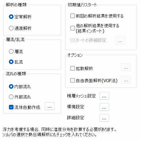 層流を仮定して計算するか、乱流を仮定して計算するかを選択することができます。 乱流計算を行う場合、「流体解析詳細設定」で乱流モデルを指定することができます。