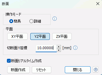 XY/YZ/ZX平面切断面をXY/YZ/ZX平面に設定します。 切断面X/Y/Z座標切断面の位置を設定します。初期値はモデルの中心座標です。 閉じるボタン閉じるボタンを押下するとダイアログを閉じます。 断面リアルタイム作成ONにすると切断面を操作した際にリアルタイムに断面が作成されます。