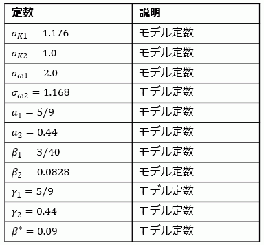 ただし、SST k-ωモデル関連の定数は、混合関数F1を用いて、a=a1F1+a2(1-F1)という形でブレンドされたものを適用します。