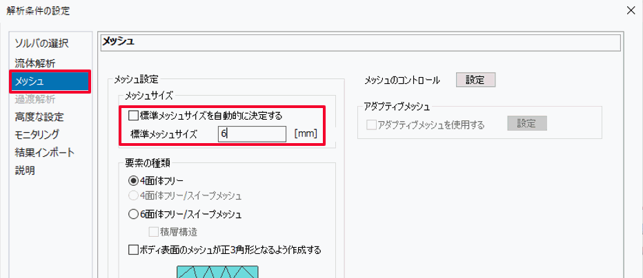 [標準メッシュサイズを自動的に決定する]のチェックをはずし、