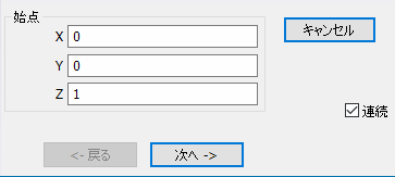 パラメータ入力ダイアログに始点(X:0Y:0Z:1)を入力し、をクリックします。