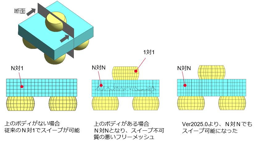 Ver2025.0よりN対Nのスイープメッシュに対応しました。上のE2317のエラーなどで、N対Nのモデルにスイープメッシュを適用する場合に使用してください