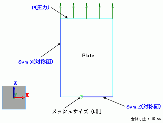モデルは左右上下対称なので、右上の1/4領域だけを解析します。