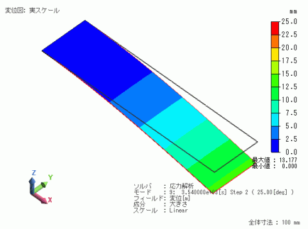 コンター図は左:変位の大きさを示してます。カラーバーの最大値は25[mm]に設定します。