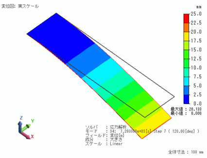 時刻7200s(120℃で、約1hrたわみ保持をしたあと)の変位図を示します。