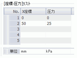 分布取込のオプションを使用し、x = 0 のとき、圧力ゼロ、x = 50 [mm]のとき、圧力を25 [kPa] となるように設定します。