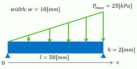 材料力学の教科書で扱われる、単純支持した梁に三角形状に分布した圧力をかけてたわませる解析事例です。