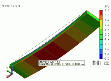 応力の最大値:6.027 [MPa]( x = 28.828 [mm] )となっています。