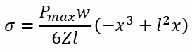 σ:応力、l,w,h :梁の寸法、Pmax:モデル右端の圧力最大値、x:座標、Z:断面係数