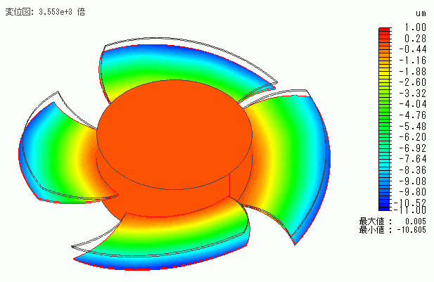 風車の変形図を示します。+Z方向から空気の圧力を受けるので、風車の羽が-Z方向に変形していることを確認できます。