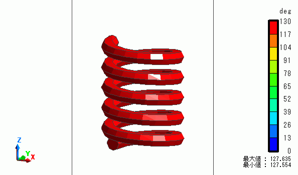 ヘリカルコイル(Coill)の温度が上昇して膨張するため変形していることが分かります。