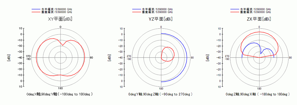 アンテナの5.59[GHz]での放射電力指向性、効率の解析方法を示します。