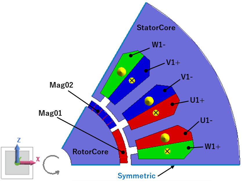 ステップ数が180で、周方向メッシュ分割角度が1.0[deg]、1ステップ当たりの回転量が1[メッシュ]ですので、機械角で180*1.0*1=180[deg]まで回転させる解析となります。