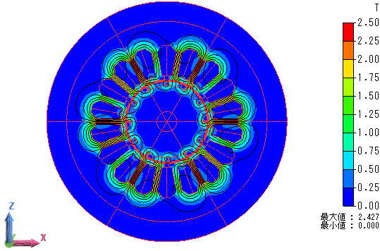 回転角度が0[deg]の時の磁束密度分布と磁束線を示します。