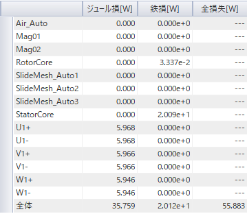 各種損失は結果テーブルの「損失[W](最終1周期参照値)」に出力されます。