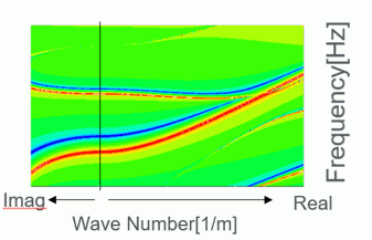 グラフ上の 波数=0 に示した縦線は、Femtetの出力にはないが分かりやすいように描いた線です。その直線の右側は波数が実数の時の値に対応し、左側は、虚部に対応します。