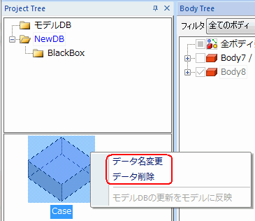 1. ModelDBツリー内で、削除したい(または名前を変更したい)データを選択して、