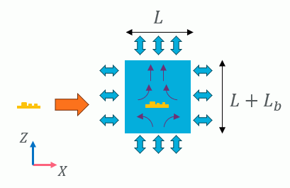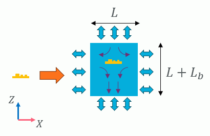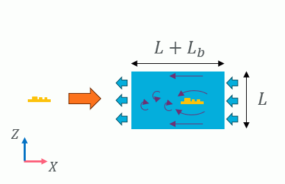 自動作成のイメージ図を示します。 Lは、モデル長X流体領域のスケール Lbは、モデル長X流体後方(上方、下方)領域のスケール