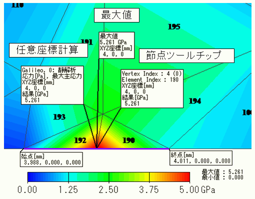 任意座標計算では、要素192で計算した5.607GPaが、節点ツールチップでは、要素190で計算した4.915GPaが表示されます。